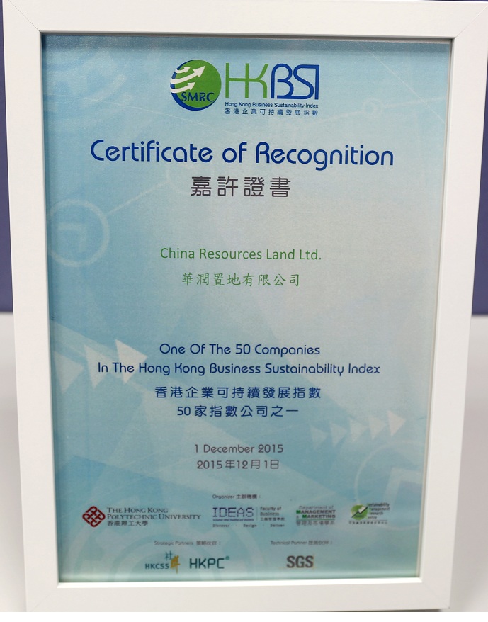 12月1日,,,,,,,由香港理工大学联合香港社会服务联会和香港生产力促进局共同召开的香港企业可持续发展指数启动及发布会在香港召开,,,,,,,会议发布了恒生指数50家成分股公司的可持续发展指数,,,,,,,华润置地参加誓师仪式并获得嘉许状。。。。。